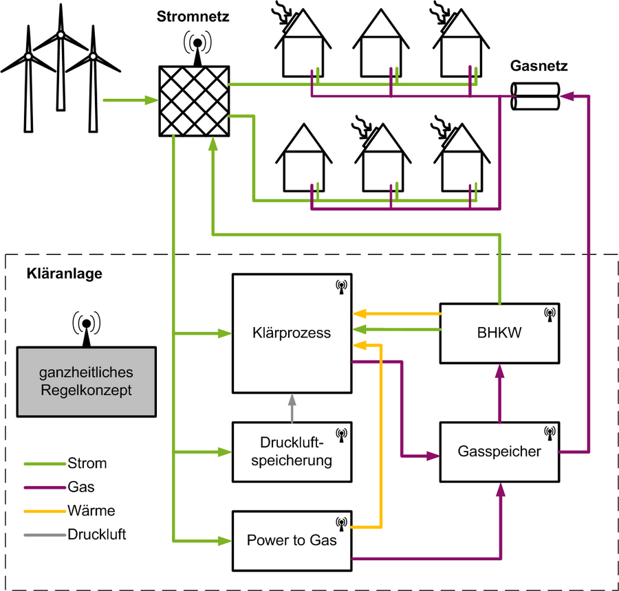 Das Verbundvorhaben ARRIVEE setzt an dieser Stelle an und will das bisher ungenutzte Potential der flächendeckend vorhandenen Kläranlagen als Speicher- und Regelbausteine durch eine intelligente Einbindung in die Verteilnetze heben. Diese Anlagen bieten mit den vorhandenen KWK-Anlagen und den zugehörigen Gasspeichern hervorragende technische Bedingungen, um Systemdienstleistungen für Verteil- und Übertragungsnetze zur Verfügung zu stellen. Des Weiteren bieten Kläranlagen durch die ohnehin anfallenden Prozesse gute Voraussetzungen für Erweiterungen durch zusätzliche Anlagen zur indirekten Speicherung von elektrischer Energie (Druckluftspeicherung, Power to Gas etc.).