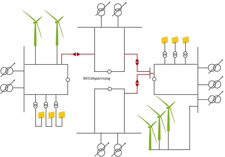 Neuartige Netztopologien mit einem höheren Vermaschungsgrad der Verteilungsnetze, erlauben es, die Aufnahmekapazität für die horizontale Einspeisung von DEA deutlich zu vergrößern. Dies gilt insbesondere dort, wo Verteilungsnetzgebiete mit hohem Anteil an DEA und solche mit geringem Anteil an DEA aber einem hohen Verbraucheranteil benachbart sind. Durch eine koordinierte Erhöhung des Vermaschungsgrades kann dort die Betriebsmittelbelastung, die Spannungshaltung und die Versorgungszuverlässigkeit verbessert werden. Um die insbesondere bei einer Vermaschung erhöhten Kurzschlussleistungen und –ströme zu beherrschen, stehen in den Untersuchungen auch neuartige Betriebsmittel wie supraleitende Kurzschlussstrombegrenzer im Fokus.