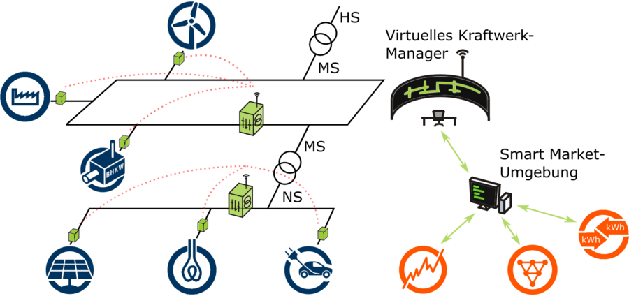 Um die geringe Anschlussleistung einzelner erneuerbarer Erzeuger und regelbarer Verbraucher zu kompensieren und Synergieeffekte zu erzielen, können sie zu einem virtuellen Kraftwerk zusammengeschlossen werden. Hieraus ergibt sich ein großes Potential, die zukünftig geforderte Flexibilität auf Verteilnetzebene zur Verfügung zu stellen. Aus praktischen Gründen wird aktuell jedoch nur ein kleiner Teil dieses Potentials ausgeschöpft, indem überwiegend Blockheizkraftwerke (BHKWs) und abschaltbare (Industrie-)Lasten zur Vermarktung von Regelenergie kombiniert werden.