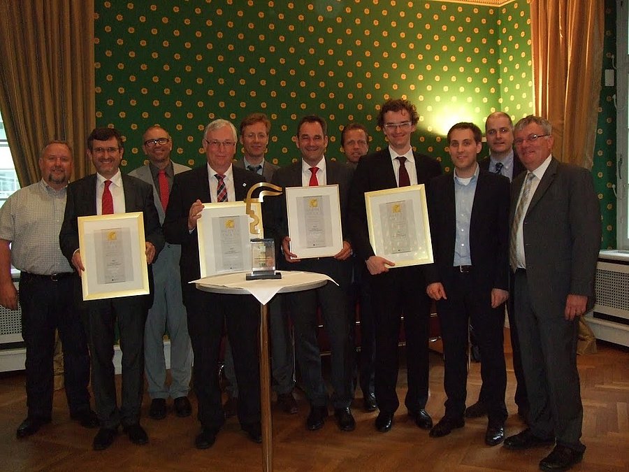 Hermes-Award 2014 - Teil des iNES-Teams mit Urkunden und Hermes in Gold