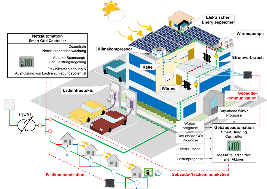 Da es sich bei einem Gebäude um ein komplexes System mit einer Vielzahl an unterschiedlichen Subkomponenten handelt, liegt der Schwerpunkt darin, die von der Verteilnetzautomatisierung ausgehenden Sollwert-Befehle innerhalb des Gebäudes entsprechend zu interpretieren und koordiniert umzusetzen. Hierzu bedarf es eines durchdringenden Überwachungs- und Regelungssystems.