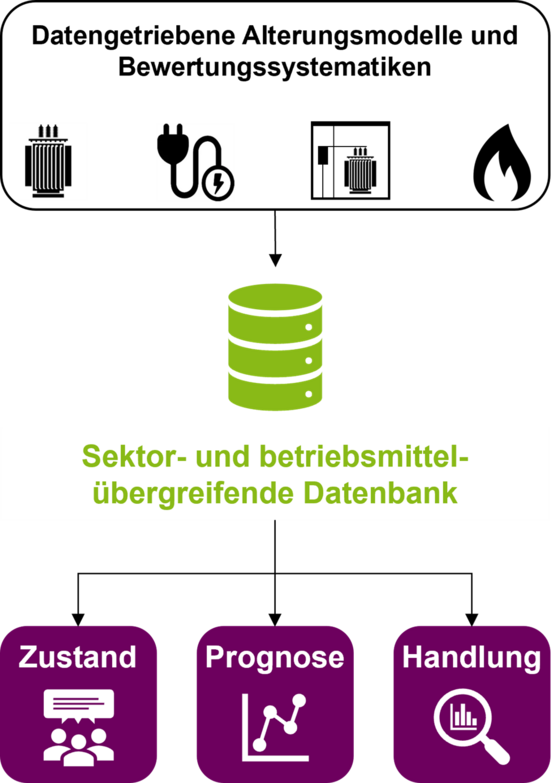 Hierzu werden die bislang getrennt geführten Datenbanken der Betriebsmittel, darunter Mittelspannungskabel, Hochspannungs- und Höchstspannungstransformatoren, Ortsnetzstationen und Gasbetriebsmittel, in ein gemeinsames, sektor- und betriebsmittelübergreifendes Datenbankmodell überführt. Dieses Datenbankmodell bildet schließlich die Grundlage für die Zustandsbewertung der Betriebsmittel.