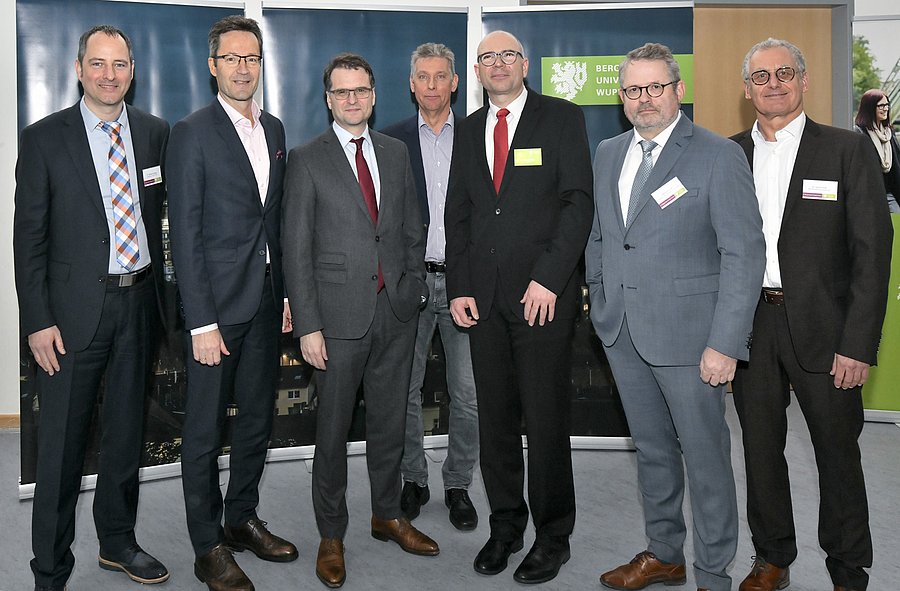 Das 5. Energie-Forum in Wuppertal war mit fast 300 hochkarätigen Teilnehmern aus ganz Deutschland und dem benachbarten Ausland ein großer Erfolg (v.l.n.r.): Dr. Michael Schwan (Siemens AG), Prof. Dr. Lambert T. Koch (Uni-Rektor), Andreas Feicht (Staatssekretär), Dr. Matthias Krumbeck (Westnetz GmbH), Prof. Dr.-Ing. Markus Zdrallek (Lehrstuhl für Elektrische Energieversorgungstechnik), Ekkehard Boden (Stadtwerke Neuss GmbH), Dr. Ulrich Groß (Rheinische NETZGesellschaft mbH) und (n.a.d. Bild) Dr. Hendrik Adolphi (Netze BW GmbH). Foto: Mutzberg